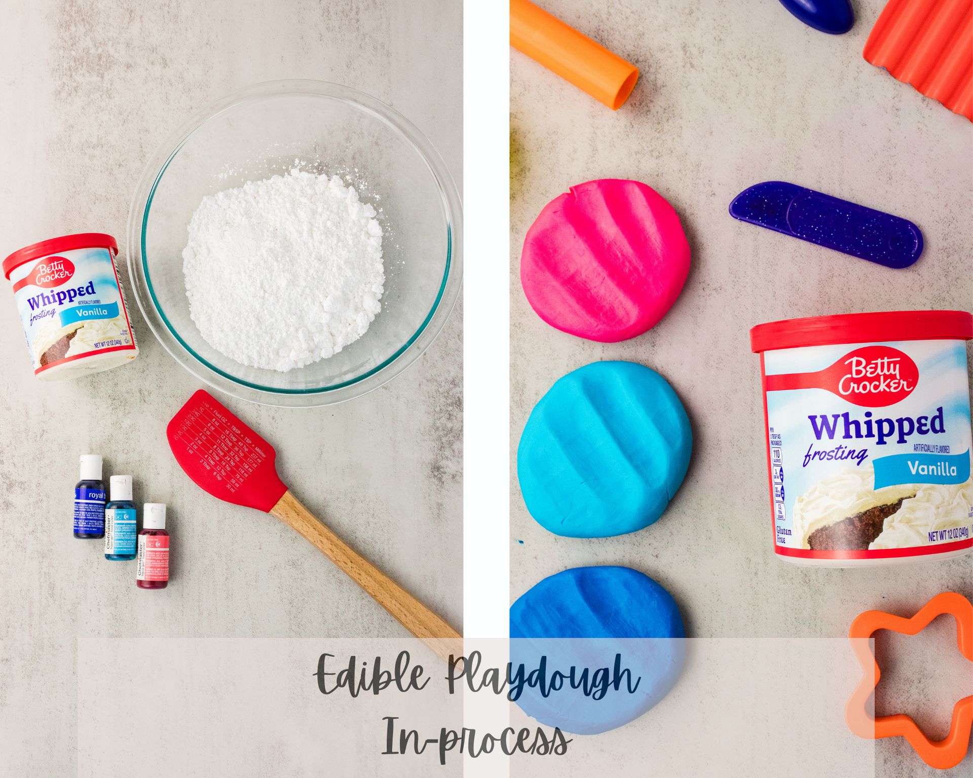 A fun NEW playdough recipe made with ONLY two ingredients: whipped frosting and powdered sugar! So soft and fun to play with!